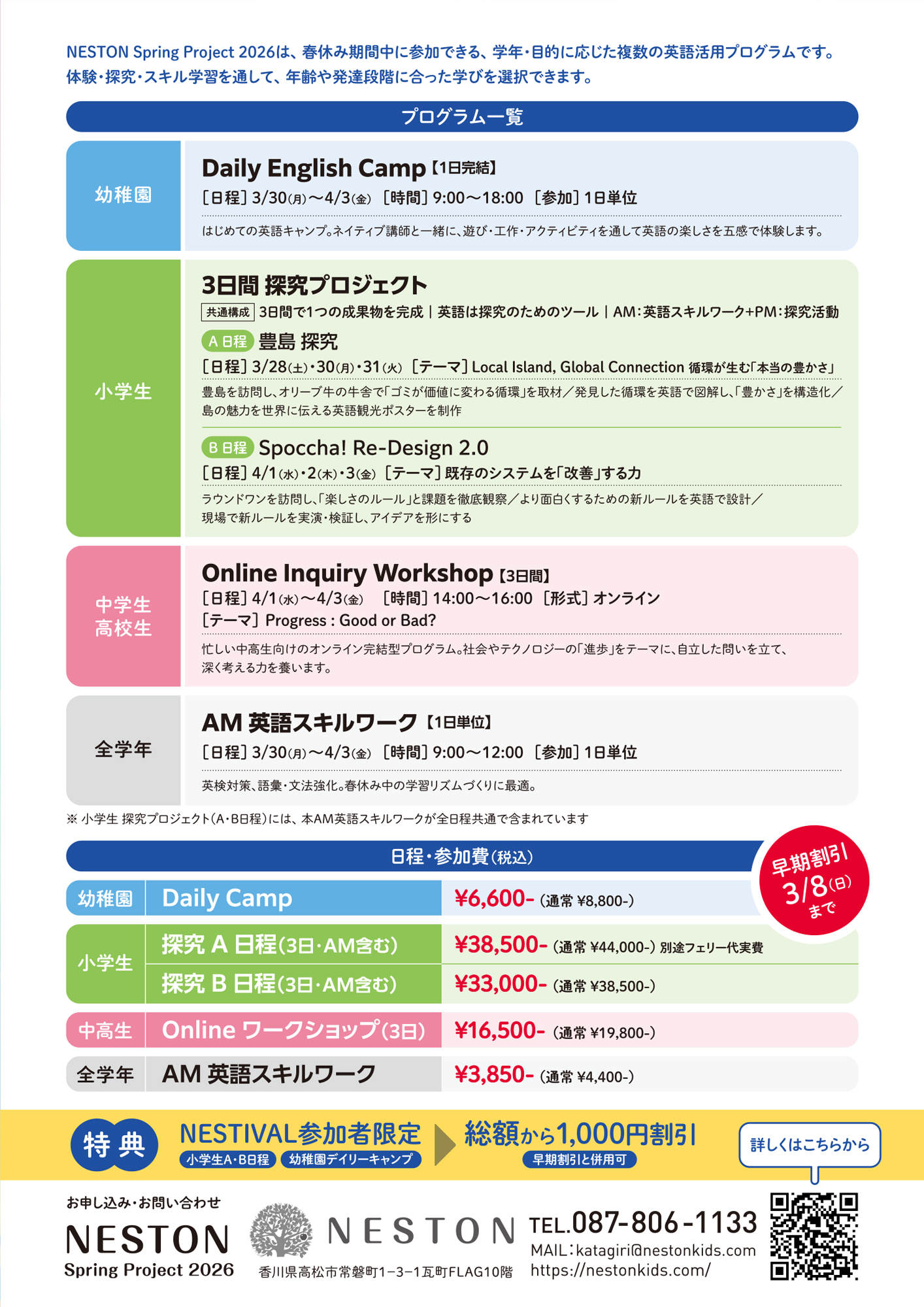 2026年春、NESTONでは年齢・発達段階に応じた探究型スプリングプログラムを開催します。