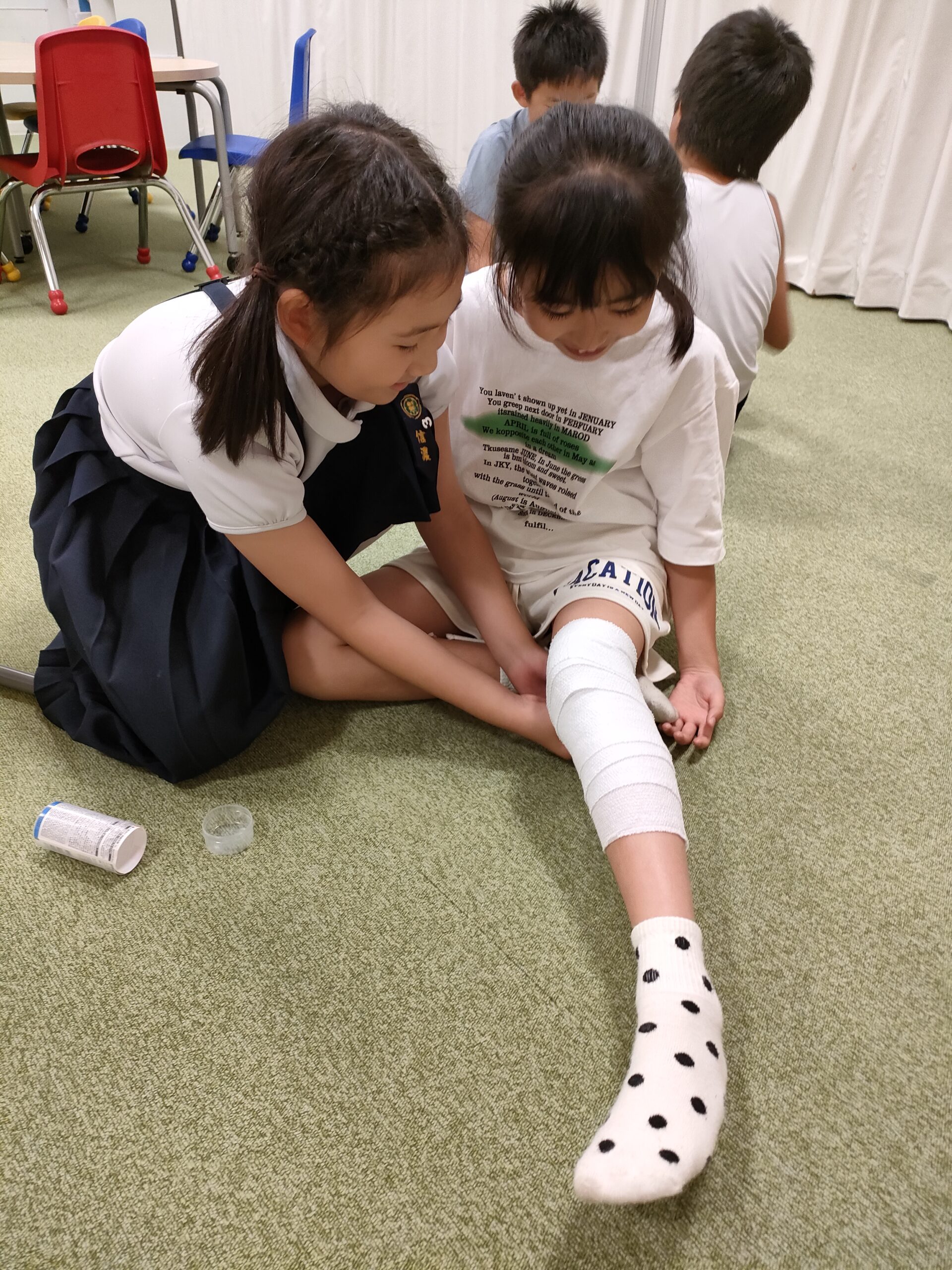 インターナショナルカルチャーのクラスで、オーストラリアのクモについて学びました。毒グモに噛まれた場合の対処法を練習しました!