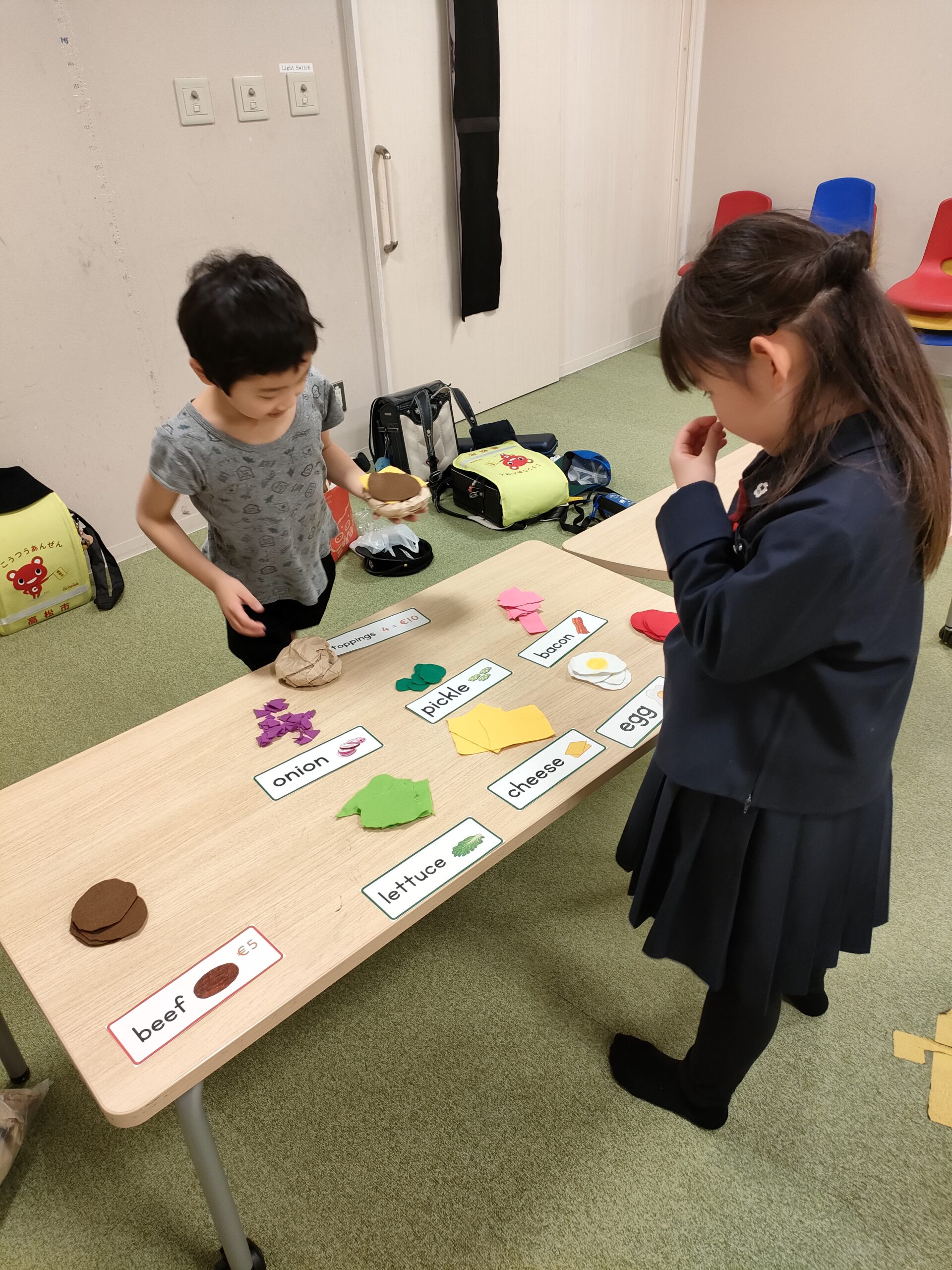 インターナショナルクラスでは、ナショナル・ハンバーガー・デーを祝いました。生徒たちは英語で料理を注文し、工作で自分たちのハンバーガーを作りました!!