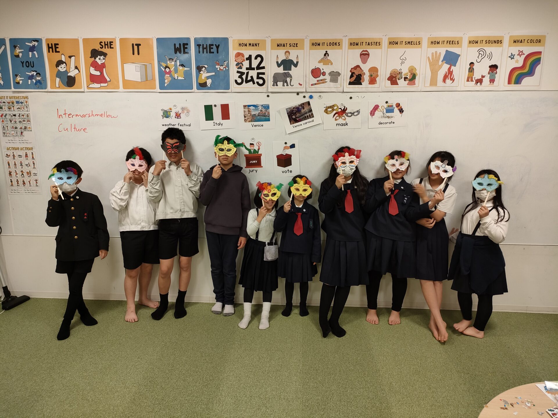 生徒たちはインターナショナル・カルチャーの授業で、ベニスのカーニバルやバリの稲刈り祭りのような、世界中のさまざまな天候に関する祭りについて学びました!