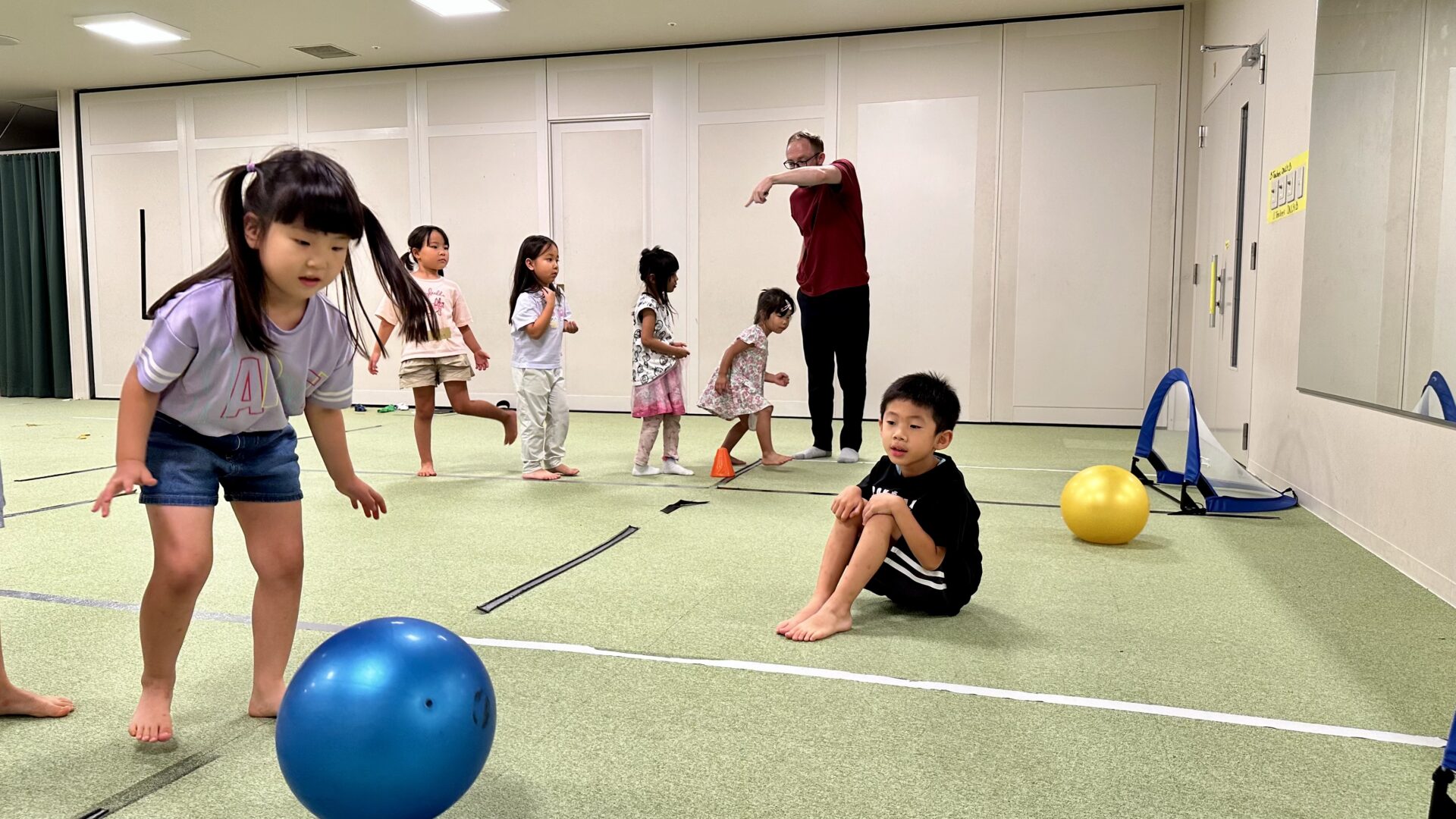 幼稚園クラスの体育では、ボールとフラフープを使って体を動かしました。