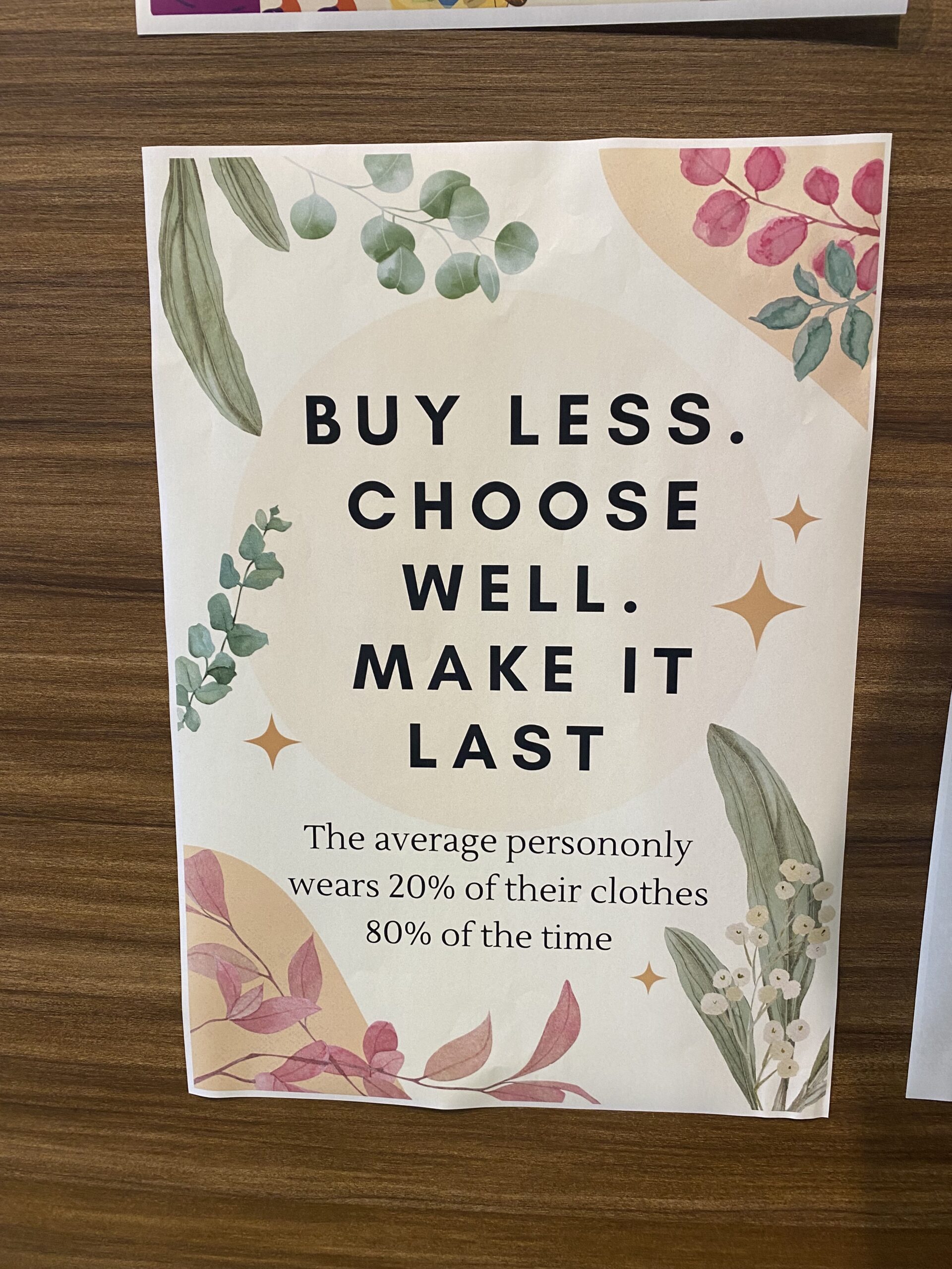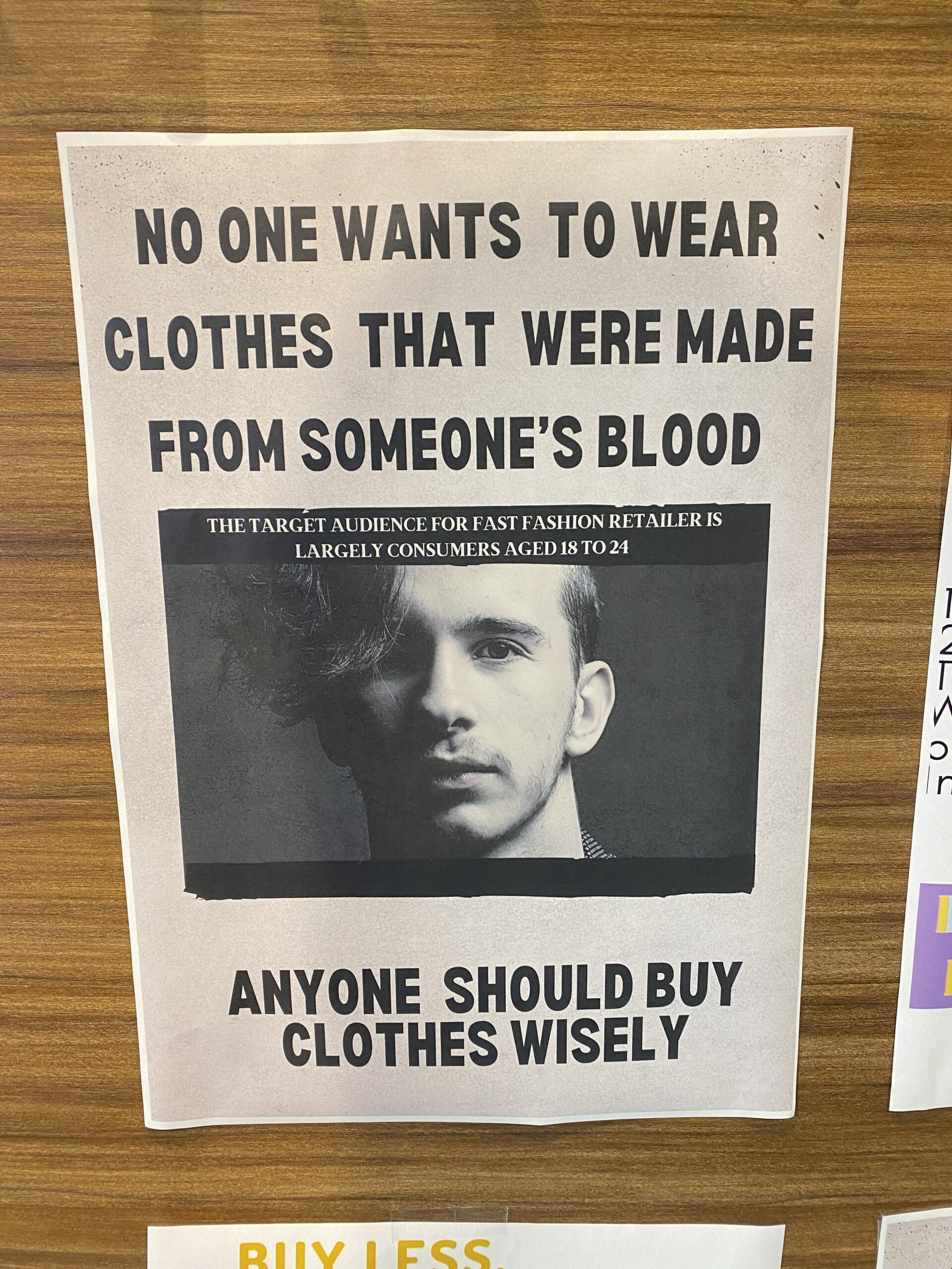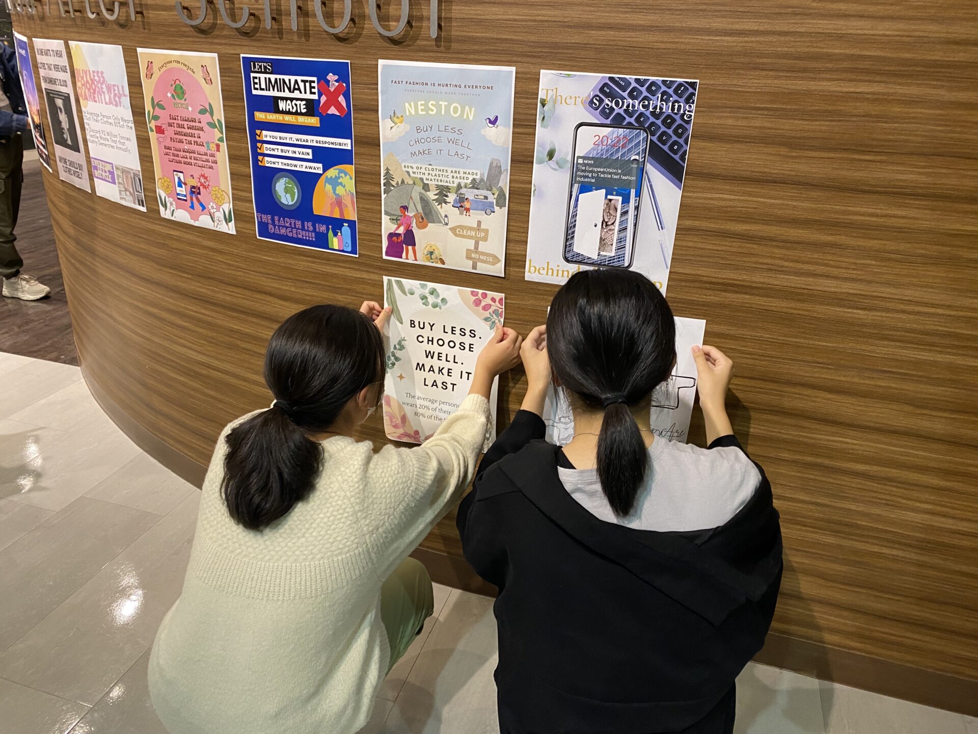 JHクラスではファストファッション業界がいかに環境に悪い影響を与えているかを学び、環境問題に関するポスターを作りました。