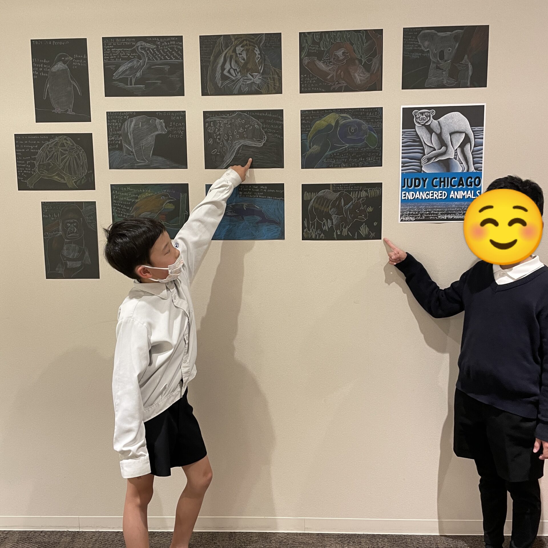 SDGsの目標14(海の豊かさを守ろう)と15(陸の豊かさも守ろう)に焦点を当て、アメリカのアーティスト、ジュディ・シカゴについて学びました。彼女は絶滅の危機にある動物を描いた有名なシリーズを描き、ジュディ・シカゴのスタイルで光る動物を構成しました。