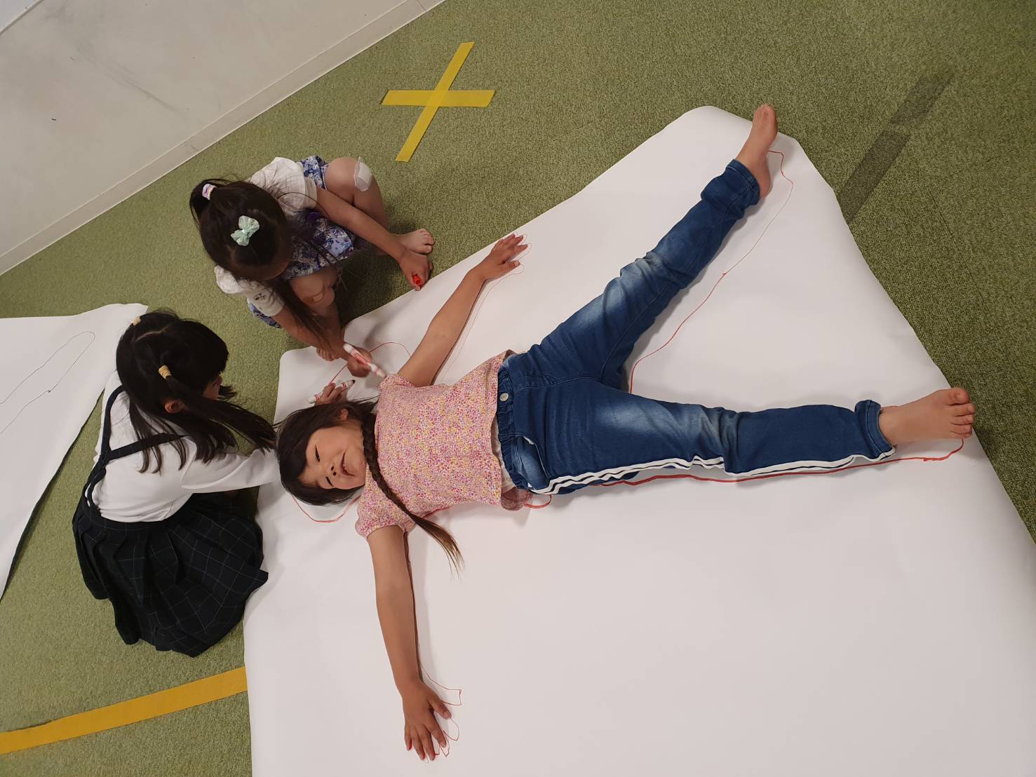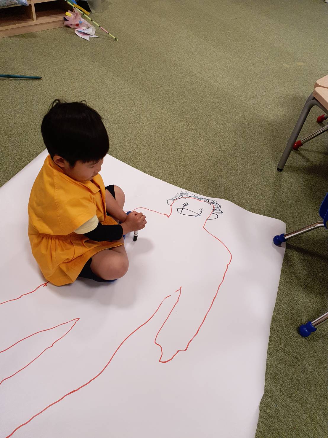 キンダーガーテンのクラスでは、体の部分について学び自分たちの体をなぞってデザインを作りました!